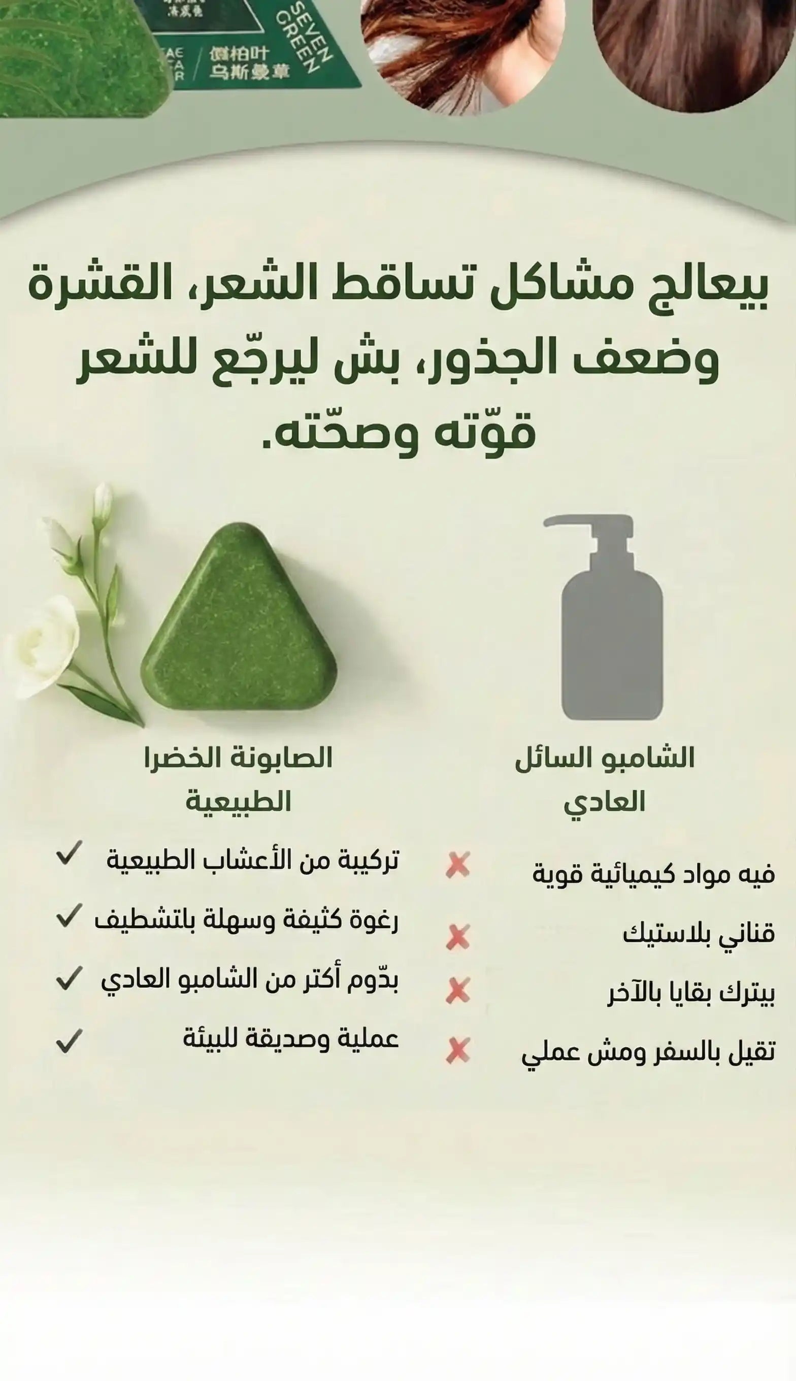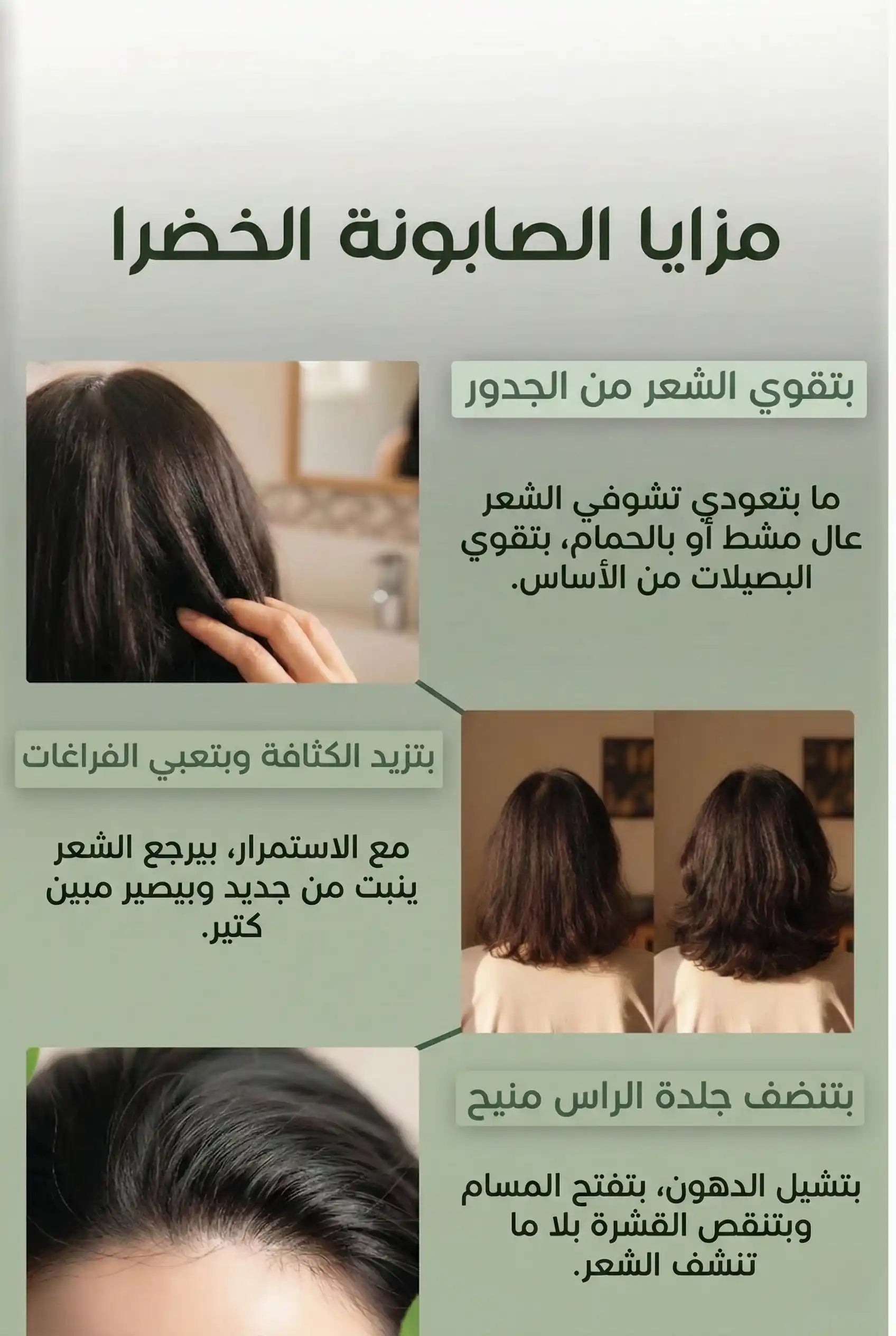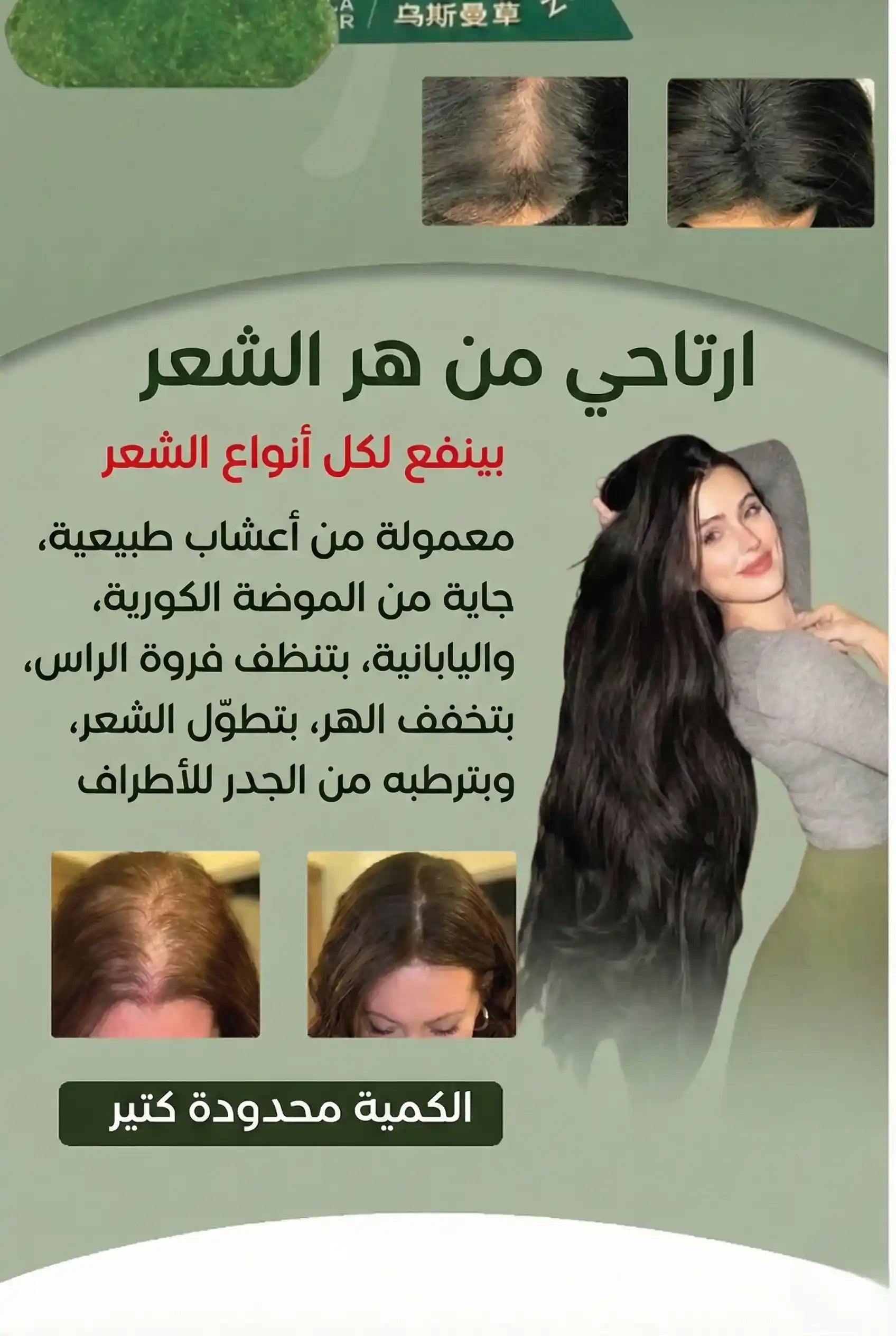 "من وقت ما بلّشت تستعمل الصابونة الكورية بالأعشاب وتنضّف فيها فروة راسها بانتظام، خفّ التساقط عندها كتير، وقويت الجذور، والأطراف صاروا أقل تقصّف، وطول شعرها بيّن بوضوح بظرف حوالي شهرين."